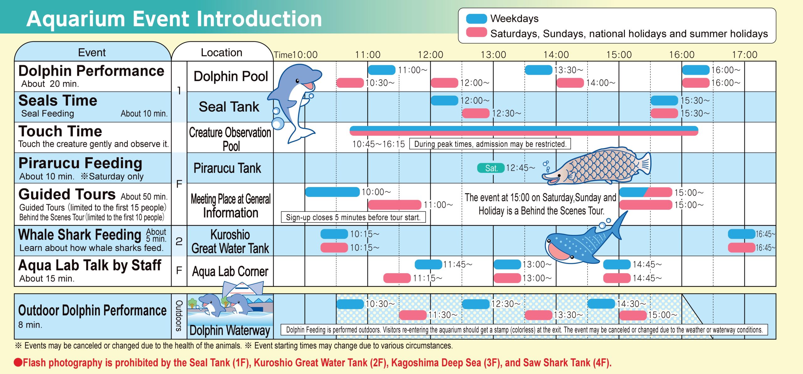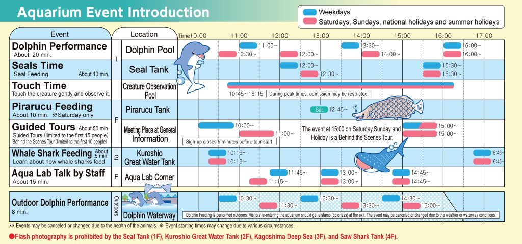 - Flash photography is prohibited at the Kurosio Great Water Tank (2F), Bigfin Reef Squid Tank (4F) and Seal Tank (1F).