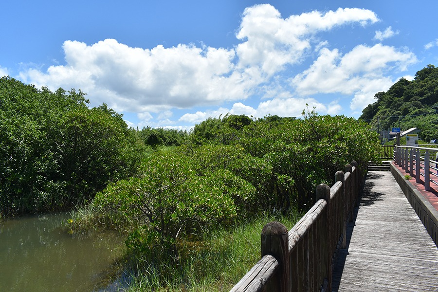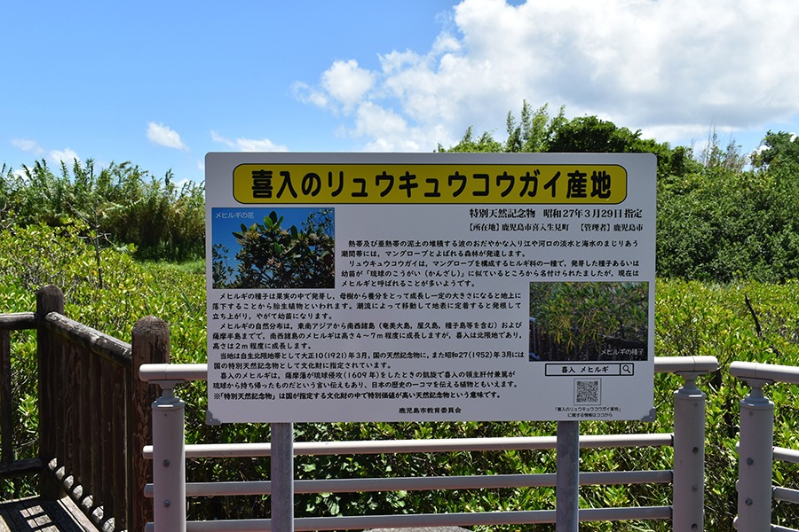 鹿児島市唯一の国指定特別天然記念物、「喜入のリュウキュウコウガイ産地」を見ることができます。リュウキュウコウガイ(標準和名:メヒルギ)はマングローブを形成する植物で、この場所は世界最北のマングローブ林の生息地のひとつとなっています。間近でマングローブ林が観察できるようにボードウォークが設置されています。