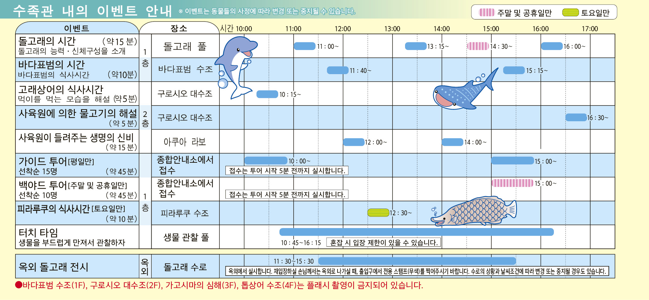 | 가이드 투어 | 관내 최신정보를 소개하면서 각 수조 및 물고기에 대해 설명합니다. (소요시간 약 50분) ※관내가 혼잡한 때 또는 혼잡이 예상되는 경우에는 가이드 투어가 중지될 수 있습니다. 토・일・공휴일 오후 3시에 개최되는 가이드 투어는 백 야드 투어로 대체됩니다. |