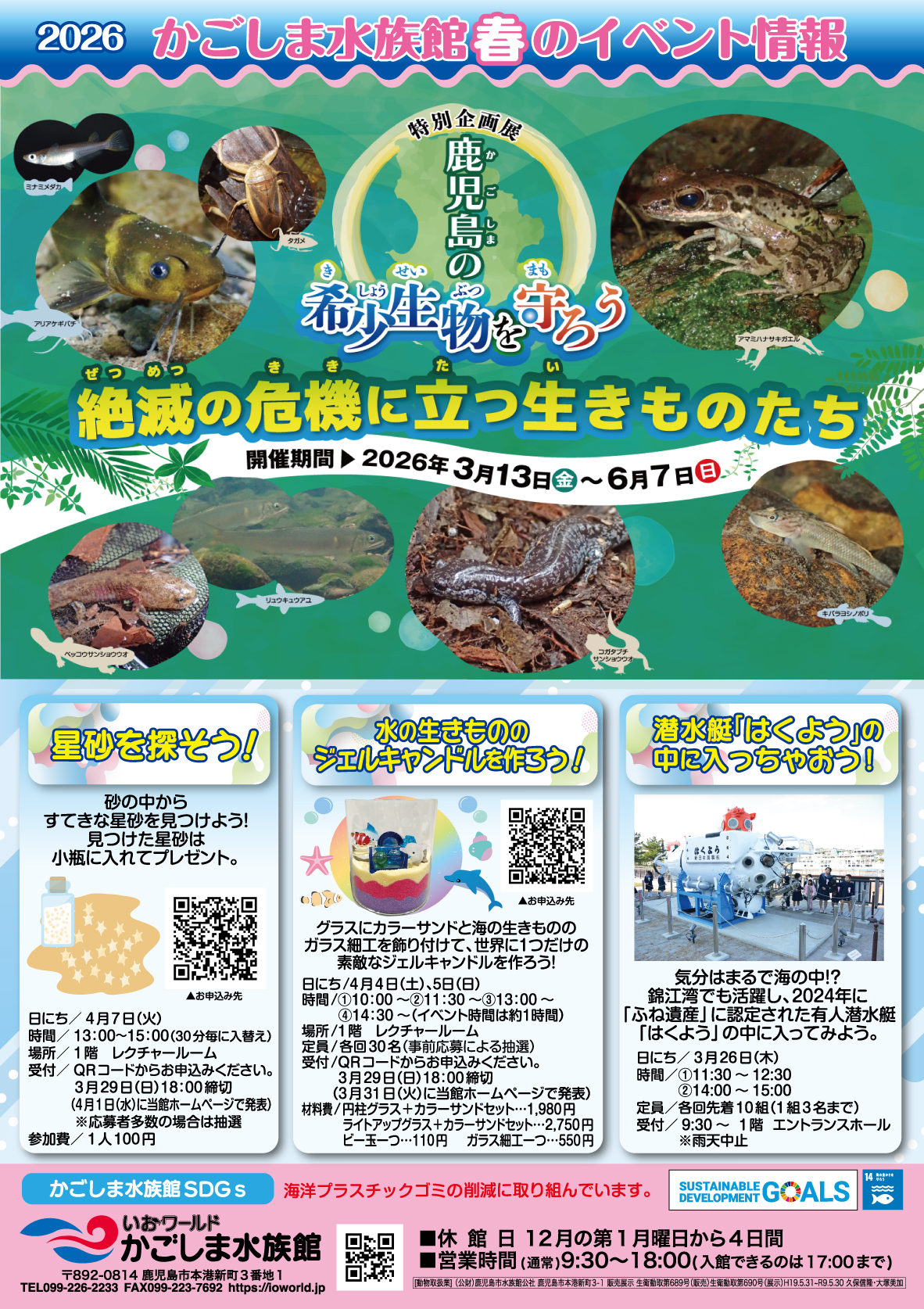 HOME お知らせ 春休みイベントのお知らせ 春休みイベントのお知らせ 2026年03月05日 一覧へ戻る 新着情報 2026年03月15日 ハンドウイルカのブリーディングローンにともなう搬出について 2026年03月10日 イルカの水路展示中止のお知らせ(3/14~17) 2026年03月10日 錦江湾情報BOXの更新作業について 2026年03月09日 レストラン提供メニュー変更について 2026年03月05日 オリジナル「魚朱印」販売開始のお知らせ(追記:期間限定マンボウの魚朱印販売開始) さらに見る
